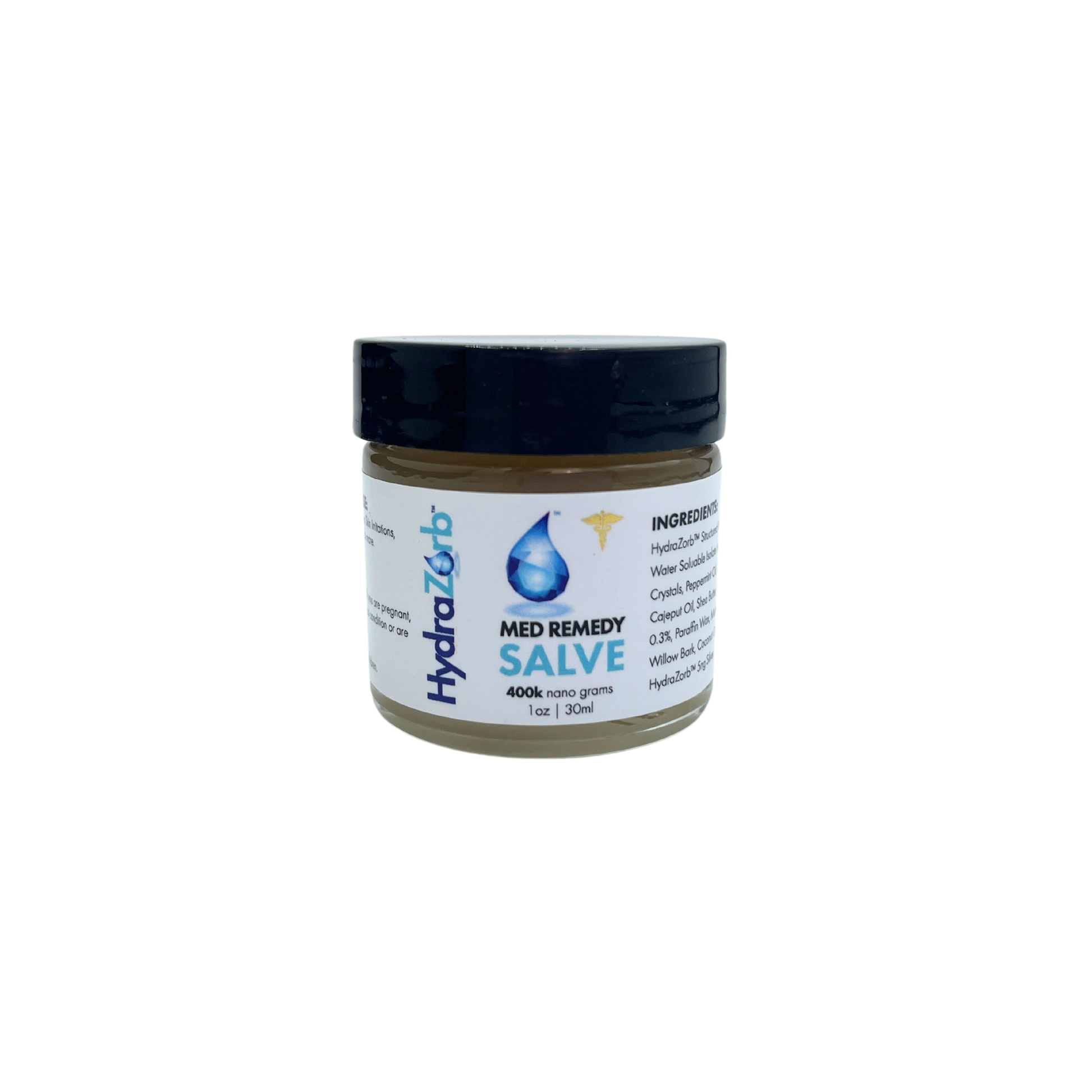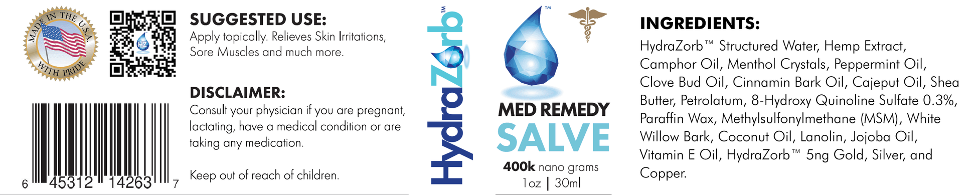 Experience targeted relief and skin rejuvenation with HydraZorb™ Med Remedy Salve, a unique blend of powerful, natural ingredients crafted to support skin health, alleviate discomfort, and promote recovery. This versatile salve combines HydraZorb™ Structured Water, essential oils, and soothing compounds like MSM and white willow bark to deliver deep, long-lasting relief from sore muscles, joint pain, and skin irritations. With the added benefits of gold, silver, and copper nanoparticles, this formula enhances cellular repair while calming inflammation.