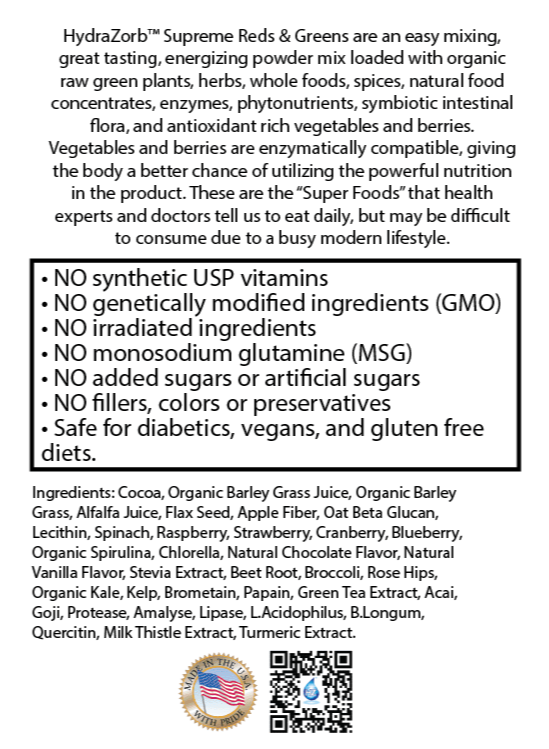 Energize your day with HydraZorb™ Supreme Reds and Greens, available in both Chocolate and Berry flavors. This nutrient-dense blend of superfoods, antioxidants, and digestive enzymes combines the powerful benefits of reds, greens, and adaptogenic mushrooms to support immunity, energy, and digestive health. Whether you prefer a rich chocolate taste or a refreshing berry flavor, Supreme Reds and Greens helps bridge the gap between daily nutrition and optimal wellness.